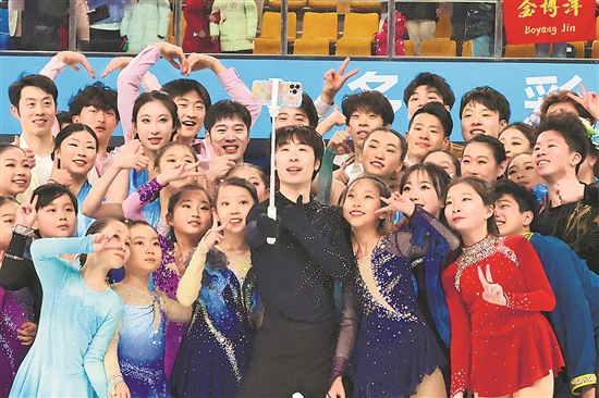 2月27日,“十四冬”花樣滑冰表演滑在內蒙古呼倫貝爾市內蒙古冰上運動訓練中心舉行。圖為表演滑結束后,運動員們在賽場合影。本報記者 蔚可任 攝