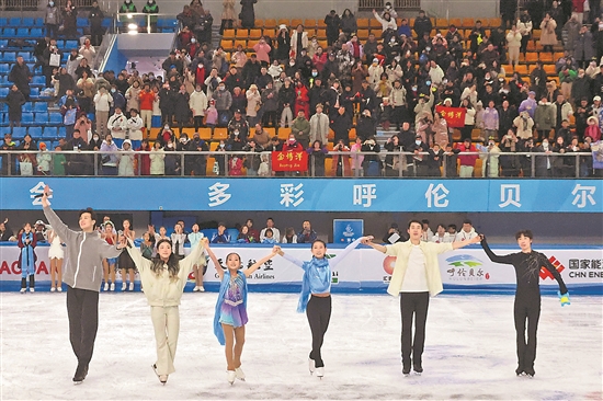 2月27日,“十四冬”花樣滑冰表演滑在內蒙古呼倫貝爾市內蒙古冰上運動訓練中心舉行。圖為表演滑結束后,運動員們向觀眾致意。 本報記者 蔚可任 攝