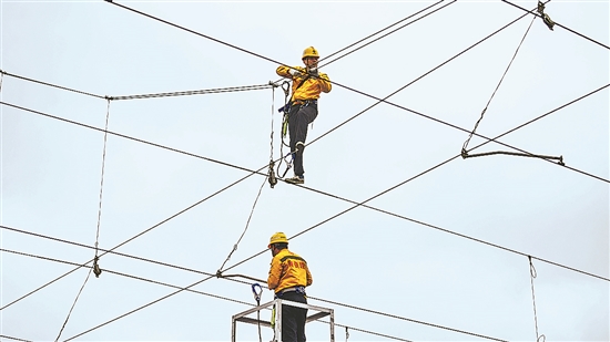 2月27日,南寧供電段的兩名接觸網(wǎng)工在檢查南寧動車所的接觸網(wǎng)線路。