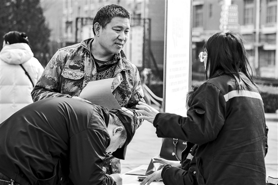 2月28日,求職者在平陰縣孔村鎮(zhèn)舉行的“春風(fēng)送崗”招聘會上尋找就業(yè)崗位。春節(jié)假期后,山東省濟(jì)南市平陰縣圍繞“春風(fēng)送崗促就業(yè)、精準(zhǔn)服務(wù)助發(fā)展”主題,組織用工企業(yè)走進(jìn)街道社區(qū),集中幫扶農(nóng)村勞動力、就業(yè)困難人員、高校畢業(yè)生等群體,方便求職者就近就地獲得就業(yè)機(jī)會。新華社記者 朱崢 攝