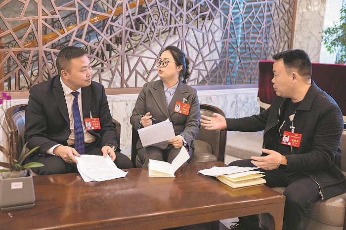 3月4日,在貴州代表團(tuán)駐地,六盤水市水城區(qū)農(nóng)業(yè)農(nóng)村局植保站站長楊恩蘭代表(圖中)與兩名村委會(huì)主任鄭培坤代表(圖左)、肖軍代表(圖右)就各自的建議進(jìn)行交流。今年全國兩會(huì)上,他們在如何更好地推動(dòng)鄉(xiāng)村振興、保障糧食安全等方面有著共同的話題。