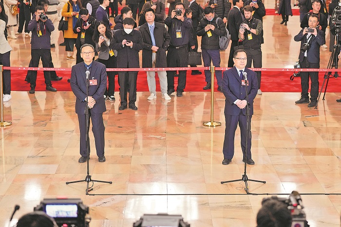 3月5日上午,十四屆全國人大二次會議首場“代表通道”開啟。圖為云岡研究院院長杭侃代表(圖左)、中國社科院考古所安陽站副站長何毓靈代表接受媒體采訪。本報記者 王偉偉 攝