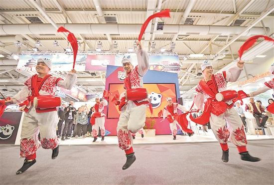 當(dāng)?shù)貢r間3月5日,來自中國陜西省的演員在德國柏林舉行的柏林國際旅游交易會中國展區(qū)表演腰鼓。新華社記者 任鵬飛 攝