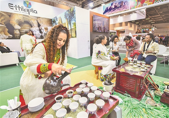 當(dāng)?shù)貢r間3月5日,在德國柏林舉行的柏林國際旅游交易會埃塞俄比亞展區(qū),工作人員為參觀者制作咖啡。新華社記者 任鵬飛 攝