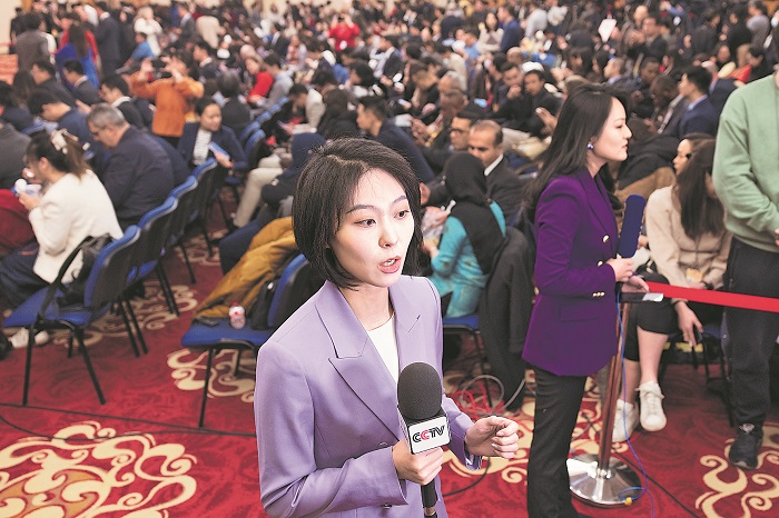 3月7日上午,在十四屆全國人大二次會議舉行的記者會現(xiàn)場,兩名女記者進行現(xiàn)場直播。本報記者 王偉偉 攝