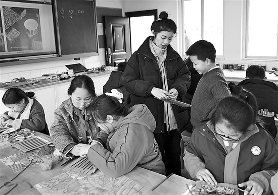 3月5日,志愿者白萱萱教學(xué)生們用廢舊物品做手工。