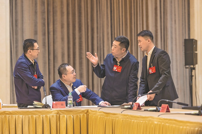 3月8日,在黑龍江代表團(tuán)小組會(huì)議結(jié)束后,通用技術(shù)齊齊哈爾第二機(jī)床有限責(zé)任公司配套分廠精密車間馬恒昌小組組長馬兵代表(右二)找到中車齊齊哈爾車輛有限公司貨車分廠電焊高級(jí)技師、高級(jí)工程師王海代表(左二),就馬兵代表提出的關(guān)于深化產(chǎn)業(yè)工人隊(duì)伍建設(shè)改革,增強(qiáng)勞模工匠榮譽(yù)感、自豪感的建議展開討論。同行的哈爾濱紅光鍋爐集團(tuán)環(huán)縫焊接組組長周曉龍代表(右一)和龍煤集團(tuán)鶴崗礦業(yè)公司峻德礦山電氣設(shè)備維護(hù)安裝公司黨支部書記兼經(jīng)理許曉林代表(左一)聽到后也加入討論。