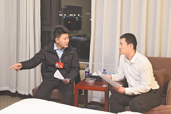 3月8日晚,總工會界別小組會議結(jié)束后,重慶海爾洗衣機(jī)有限公司噴粉班班長盧躍富委員(圖左)和中國航天科技集團(tuán)一院首都航天機(jī)械有限公司主任工藝師劉爭委員繼續(xù)就“兩高”工作報告展開交流。在今天的小組會議上,盧躍富委員建議,應(yīng)當(dāng)通過立法的形式,切實(shí)保障職工“離線休息權(quán)”。本報記者 吳凡 攝