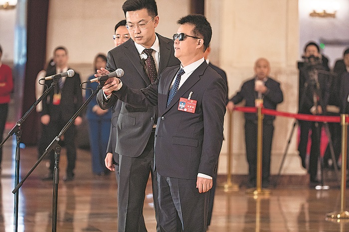 在3月8日十四屆全國人大二次會議第二場“代表通道”上,工作人員正在幫助首位盲人全國人大代表、福建省殘聯(lián)兼職副理事長王永澄用手感知話筒的距離。