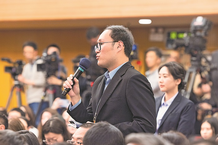 圖為本報(bào)記者李潤(rùn)釗在十四屆全國(guó)人大二次會(huì)議民生主題記者會(huì)上提問。本報(bào)記者 王偉偉 攝