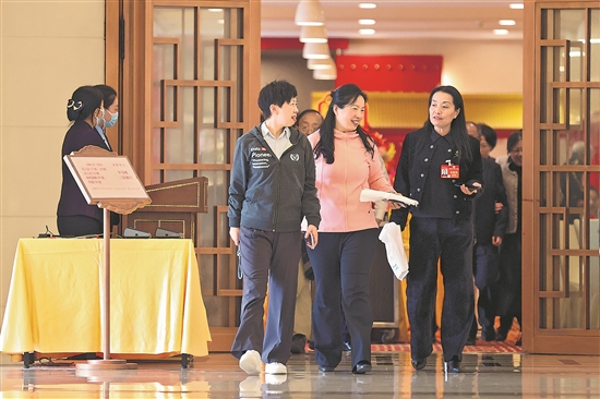 3月10日中午,在北京會議中心駐地,中國兵器工業(yè)集團(tuán)公司首席技師馬秀麗委員(右一)和姜妍委員(右二)、張濤委員(左二)在就餐后,一起交流履職經(jīng)驗(yàn)。