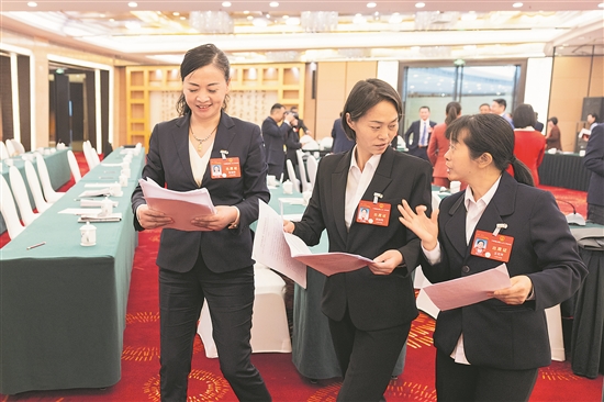 3月10日,在江西代表團(tuán)駐地,九江市公共交通集團(tuán)公司公交駕駛員張海榮代表(左一)、九江鑫城紡織有限公司職工熊曉梅代表(左二)、江西貫勝鞋業(yè)有限公司針車鞋面合縫工人王花萍代表(右一)在會(huì)場(chǎng)內(nèi)交流。