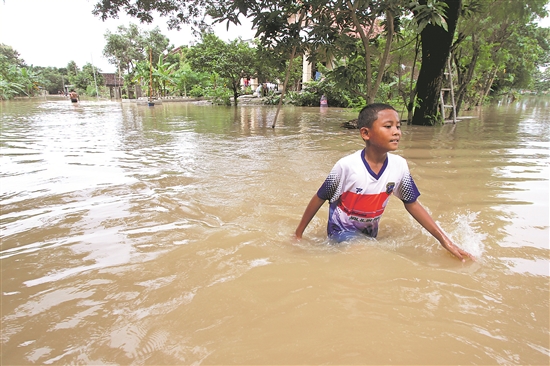 當(dāng)?shù)貢r(shí)間3月10日,在印度尼西亞中爪哇省斯拉根,一名男孩涉水前行。印度尼西亞中爪哇省近日強(qiáng)降雨致梭羅河水位升高,部分區(qū)域遭遇洪水災(zāi)情。新華社發(fā)(布拉姆·澤洛 攝)