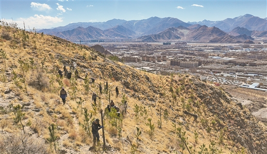 3月12日,西藏拉薩市堆龍德慶區(qū)東嘎社區(qū)二組村民在西嘎山植樹。
