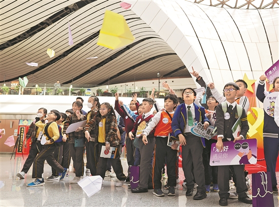 3月12日,搭乘香港快運(yùn)航空首航航班抵京的香港中小學(xué)生參觀團(tuán)在大興國(guó)際機(jī)場(chǎng)航站樓內(nèi)參加活動(dòng)。