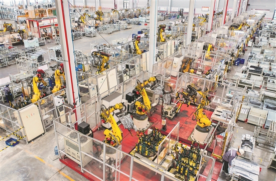在位于浙江省湖州市長(zhǎng)興經(jīng)濟(jì)技術(shù)開(kāi)發(fā)區(qū)的長(zhǎng)興地通汽車部件有限公司,全自動(dòng)機(jī)器人高速運(yùn)轉(zhuǎn)生產(chǎn)新能源汽車配件訂單產(chǎn)品。