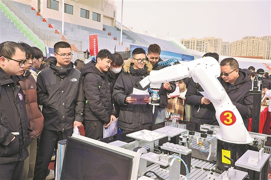 日前,在山東省青島市李滄區(qū)總工會承辦的青島市高校畢業(yè)生就業(yè)服務活動啟動儀式暨大型招聘會現(xiàn)場,一家招聘企業(yè)帶來的工業(yè)機器人產品吸引多名高校畢業(yè)生駐足咨詢。楊明清 本報記者 張嬙 攝