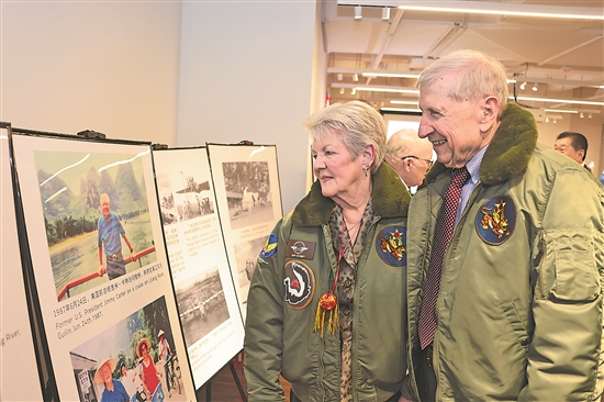 當(dāng)?shù)貢r間3月11日,美中航空遺產(chǎn)基金會副主席金坎農(nóng)(左)及其丈夫身著飛虎隊制服在美國紐約參觀“中美友好在廣西”圖片展。為慶祝中美建交45周年,“中美友好在廣西”圖片展11日在紐約開幕。 新華社發(fā)(周煥新 攝)