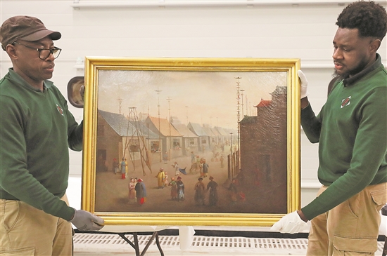 當(dāng)?shù)貢r間3月11日,在法國巴黎近郊的凡爾賽宮,工作人員準(zhǔn)備打包油畫《南京的集市》。新華社記者 高靜 攝