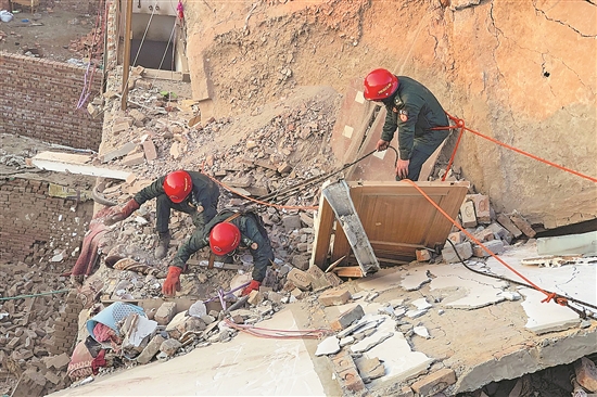 當(dāng)?shù)貢r間3月12日,在巴基斯坦東部旁遮普省木爾坦市,救援人員在事故現(xiàn)場搜救。 巴基斯坦東部旁遮普省木爾坦市一座樓房12日清晨倒塌,造成9人死亡、2人受傷。新華社發(fā)
