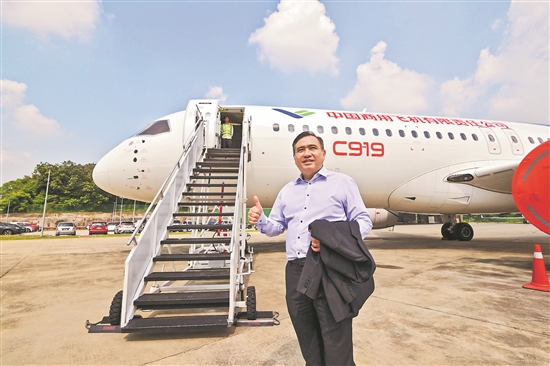 中國國產(chǎn)商用飛機(jī)ARJ21和C919日前飛抵位于馬來西亞雪蘭莪州的蘇丹阿卜杜勒·阿齊茲·沙阿機(jī)場(chǎng),進(jìn)行地面靜態(tài)展示和演示飛行。圖為馬來西亞交通部長(zhǎng)陸兆福與C919大飛機(jī)合影。 新華社發(fā)(張紋綜 攝)