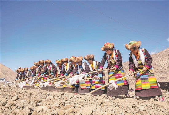 這是3月16日拍攝的西藏自治區(qū)山南市瓊結(jié)縣加麻鄉(xiāng)加麻村的春耕儀式現(xiàn)場(chǎng)。當(dāng)日是西藏舉行一年一度春耕大典的日子。村民身著節(jié)日盛裝,手捧“切瑪”(五谷豐登斗),唱起祈愿歌,互敬青稞酒。新華社記者 旦增尼瑪曲珠 攝
