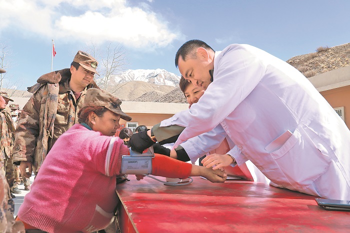 3月14日,醫(yī)療專(zhuān)家為護(hù)邊員測(cè)量血壓。