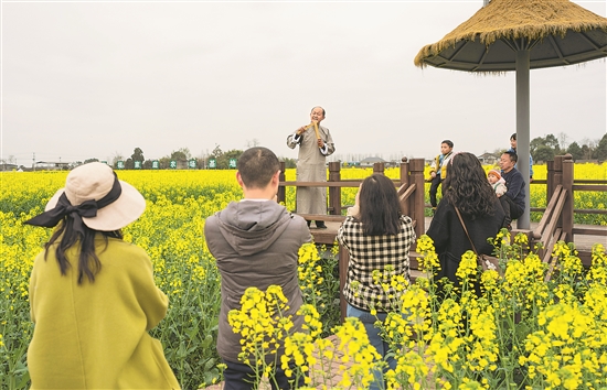 3月17日,在四川省綿陽(yáng)市安州區(qū)秀水鎮(zhèn)的油菜花海中,非遺傳承人劉俗兵在表演四川金錢板,吸引游客圍觀。