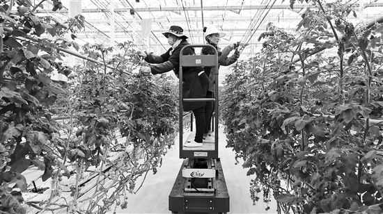 3月17日,江蘇省連云港市海州區(qū)浦南鎮(zhèn)番茄莊園,工人在管護番茄苗。連云港市海州區(qū)浦南鎮(zhèn)番茄莊園擁有超過720畝的設(shè)施番茄種植基地,集現(xiàn)代化無土栽培技術(shù)、現(xiàn)代園林造景藝術(shù)、國內(nèi)外先進的番茄生產(chǎn)設(shè)施設(shè)備于一體,實行番茄生產(chǎn)統(tǒng)一品種、統(tǒng)一技術(shù)、統(tǒng)一標(biāo)準(zhǔn)、統(tǒng)一銷售,探索生態(tài)休閑都市農(nóng)業(yè)發(fā)展新模式,以科技農(nóng)業(yè)、智慧農(nóng)業(yè)壯大番茄產(chǎn)業(yè),一棵棵小番茄已經(jīng)成為當(dāng)?shù)卮龠M農(nóng)民增收的“金果果”。