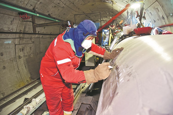 3月14日,在長(zhǎng)江江底70米深處,中國(guó)石油管道局四公司員工正在進(jìn)行中俄東線天然氣管道工程建設(shè)。工程采用該局自主知識(shí)產(chǎn)權(quán)的CPP900全自動(dòng)焊接裝備進(jìn)行施工,現(xiàn)場(chǎng)技術(shù)員通過(guò)對(duì)施工數(shù)據(jù)的全過(guò)程采集,實(shí)現(xiàn)全生命周期數(shù)據(jù)成果移交。施焊結(jié)束后,質(zhì)檢員對(duì)焊道外觀、焊縫寬度、余高等進(jìn)行檢查,并及時(shí)填寫(xiě)相關(guān)信息。每道焊口都有了自己的“身份證”,一旦出現(xiàn)工程質(zhì)量問(wèn)題,能追根尋源到原始記錄。