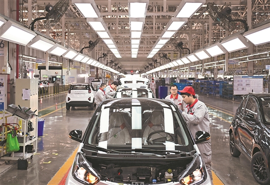 3月19日,奇瑞新能源汽車股份有限公司石家莊分公司的工人在總裝車間生產線上工作。