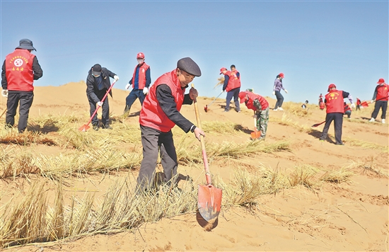 當(dāng)日,甘肅省武威市古浪縣2024年春季義務(wù)壓沙活動(dòng)在騰格里沙漠南緣拉開帷幕,1700多名干部職工和群眾參加義務(wù)壓沙活動(dòng)。