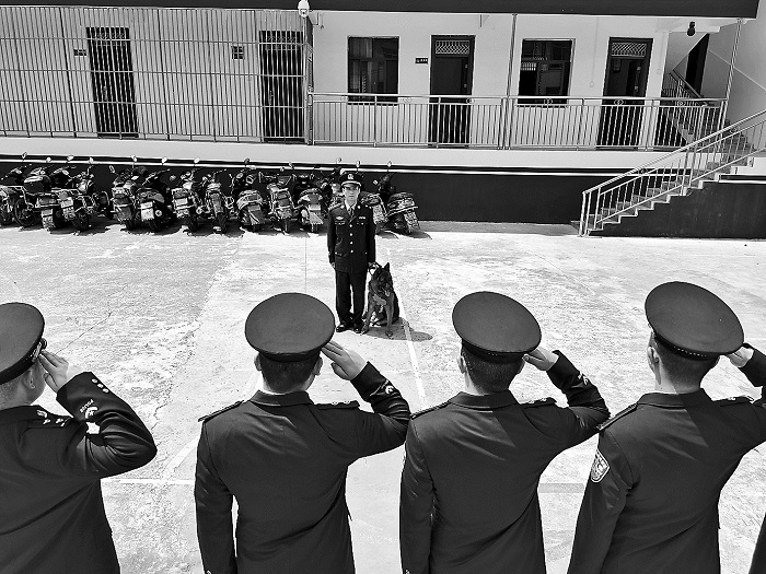 黑澤退役那天,郎恒邊境派出所全體民輔警,向它敬禮送別。戴著大紅花的黑澤,顫巍巍地艱難起身,回禮告別戰(zhàn)友。