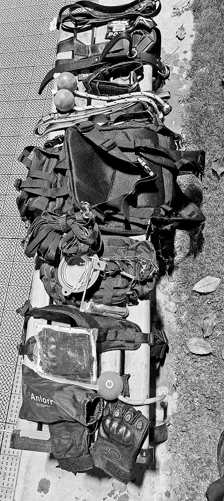 走進(jìn)小院,平房旁邊的水泥地上,分區(qū)擺著火圈、行李箱、撲咬袖等各種馴犬工具,有的用于訓(xùn)練警犬嗅覺,有的用來鍛煉服從性,還有的用以提升撲咬能力,以及其他技能和本領(lǐng)。