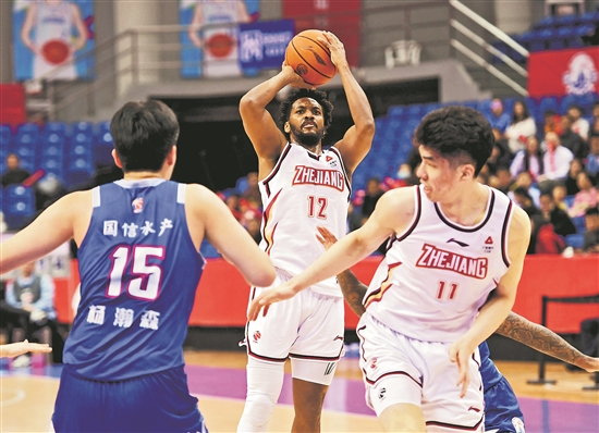 3月18日,浙江隊球員蓋利(中)在比賽中投籃。當日,在2023~2024賽季中國男子籃球職業(yè)聯賽(CBA)常規(guī)賽第45輪比賽中,浙江隊客場106比99戰(zhàn)勝青島隊。本賽季CBA常規(guī)賽由上賽季42輪增至52輪,目前已進入爭奪季后賽名額的最后階段。新華社記者 李紫恒 攝