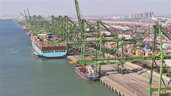 圖為3月20日,貨輪靠泊在天津港北航道內(nèi)的泊位中(無人機照片)。