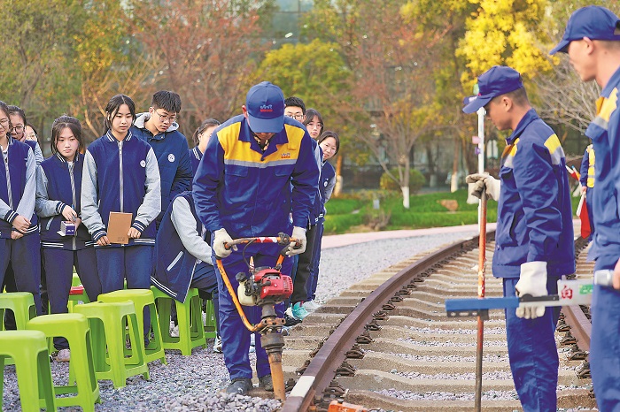 馮水龍和他的團(tuán)隊(duì)帶領(lǐng)學(xué)生們了解電氣化鐵路接觸網(wǎng)知識(shí),現(xiàn)場(chǎng)演示鐵路養(yǎng)護(hù)維修工器具的使用方法,提升了學(xué)生鐵路安全意識(shí),播撒下一顆顆匠心夢(mèng)想。本報(bào)通訊員 胡樂(lè)焙 李科 攝