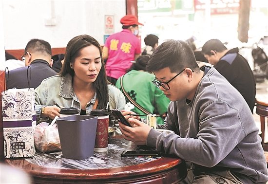 3月20日,在廣西南寧市人民西路一家老友粉店,顧客在吃老友粉。老友粉是廣西南寧市具有獨(dú)特地方風(fēng)味的食品,它的制作技藝已被列入廣西非物質(zhì)文化遺產(chǎn)名錄,深受人們的喜愛(ài)。