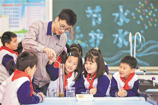 3月21日,在山東省青島弘德小學(xué),污水處理廠講解員指導(dǎo)學(xué)生做實(shí)驗(yàn)。3月22日世界水日,各地舉行形式多樣的愛水節(jié)水護(hù)水活動(dòng),提升公眾環(huán)保意識(shí),守護(hù)生態(tài)環(huán)境。