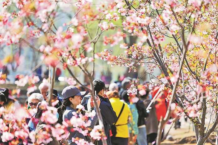 3月22日,北京玉淵潭公園,游客在打卡拍照。近日,玉淵潭公園第三十五屆櫻花文化活動暨第五屆春季花卉聯(lián)展拉開序幕。園區(qū)打造了賞特色花卉、觀特色展覽、參特色互動、享特色體驗、購特色文創(chuàng)5大板塊共10余項內容,多維度展示公園文化。本報記者 蔚可任 攝