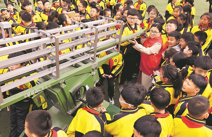 3月22日,在山東省棗莊市東湖小學(xué),氣象志愿服務(wù)者在向?qū)W生們講解人工增雨防雹科普知識。