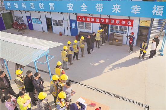 3月22日,安徽省六安市長三角一體化物流園建設(shè)項目工地,工人參加健康體檢。