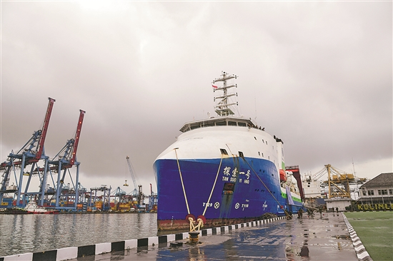 這是當(dāng)?shù)貢r(shí)間3月22日在印度尼西亞雅加達(dá)拍攝的??吭诘と植宦蹈鄣摹疤剿饕惶?hào)”科考船。中國(guó)科學(xué)院深??茖W(xué)與工程研究所與印度尼西亞國(guó)家研究創(chuàng)新署3月23日順利完成為期一個(gè)月的爪哇海溝聯(lián)合科考。其間,兩國(guó)科研人員借助“奮斗者”號(hào)全海深載人潛水器成功下潛7178米,創(chuàng)下印尼深海下潛新紀(jì)錄。新華社記者 徐欽 攝