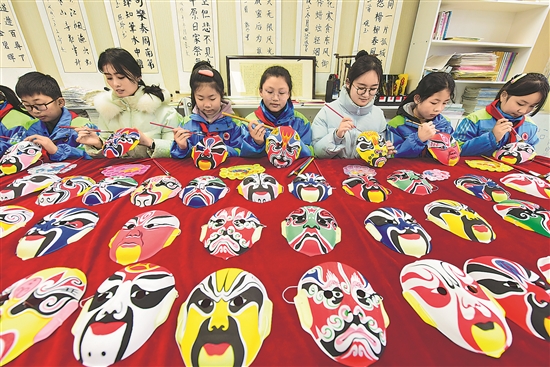 3月25日,江蘇省連云港市東海縣溫泉鎮(zhèn)中心小學(xué)老師和學(xué)生繪制“京劇臉譜”。當(dāng)日,該校開(kāi)展了“繪臉譜 揚(yáng)國(guó)粹”的主題活動(dòng),讓學(xué)生了解中國(guó)戲劇文化,迎接3月27日“世界戲劇日”的到來(lái)。本報(bào)通訊員 張正友 攝