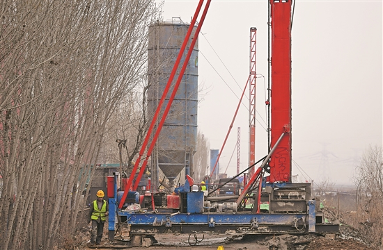 3月25日,高壓旋噴樁機(jī)在天津市靜海區(qū)臺頭北圍埝進(jìn)行加固作業(yè)。