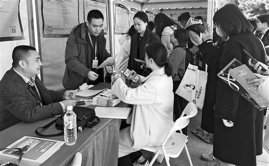 3月20日,“2024年春季綜合類專場(chǎng)雙選會(huì)—北京師范大學(xué)站”在北京師范大學(xué)舉行,吸引了80家用人單位參與,面向畢業(yè)生提供1000個(gè)以上招聘需求。圖為一招聘單位工作人員向?qū)W生介紹該公司業(yè)務(wù)和崗位需求。 本報(bào)記者 于忠寧 攝