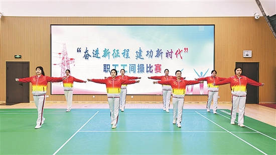為提高全民健身意識,強健員工身體素質(zhì),國網(wǎng)松原供電公司堅持以人為本、因地制宜、員工受益的原則,依托活動中心、職工小家等場所,定期開展籃球、羽毛球、工間操等健身活動,在企業(yè)掀起了全民健身熱潮,營造了以關(guān)愛員工健康促進企業(yè)和諧發(fā)展的良好氛圍。圖為近日該公司員工工間操比賽現(xiàn)場。(張文琦 攝)