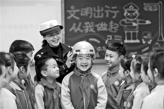 3月25日,在山東省青島汾陽路小學(xué),民警給學(xué)生講解如何正確佩戴頭盔。當(dāng)日是全國中小學(xué)生安全教育日,青島市公安局交通警察支隊(duì)李滄大隊(duì)民警走進(jìn)小學(xué),開展“文明出行 從我做起”主題活動,引導(dǎo)學(xué)生文明出行。本報(bào)通訊員 張鷹 攝