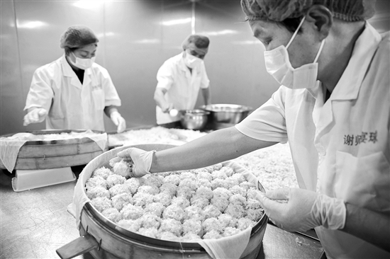 3月24日,浙江省海寧市長(zhǎng)安鎮(zhèn)的一處“共富工坊”內(nèi),工人正在車間內(nèi)制作當(dāng)?shù)胤沁z小吃——長(zhǎng)安宴球。該小吃在當(dāng)?shù)貜V受歡迎且純手工制作,用工需求量大。截至目前,“共富工坊”已吸納興福村周邊近30名村民靈活就業(yè),其中低收入農(nóng)戶兩人,提供本地務(wù)工100人次,帶動(dòng)30多戶村民增收。本報(bào)記者 王偉偉 攝