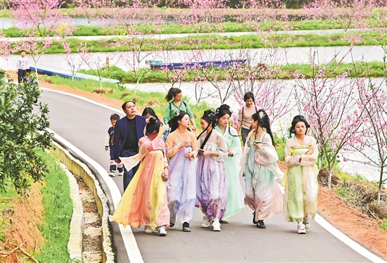 3月26日,江西省撫州市崇仁縣許坊鄉(xiāng)許坊村連片桃花盛開,身穿“新中式”服飾的游客前來賞花打卡。萬物爭春時節(jié),許多游客選擇到戶外踏青,國潮文化、鄉(xiāng)村土味、民俗風(fēng)情成為激發(fā)“春日經(jīng)濟”的新動能。本報通訊員 朱海鵬 攝